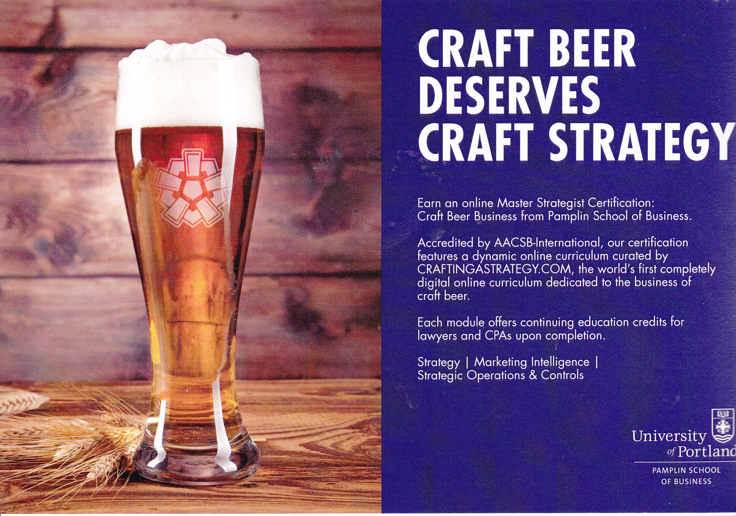 Let’s start with the most recent example and consider the slogan, “Craft Beer Deserves Craft Strategy.” This phrase on the cover of the brochure below announced University of Portland’s Master Strategist Certificate – the world’s first graduate level training dedicated to the business of craft beer. In the words of UP’s Dean of Business, Robin Anderson: