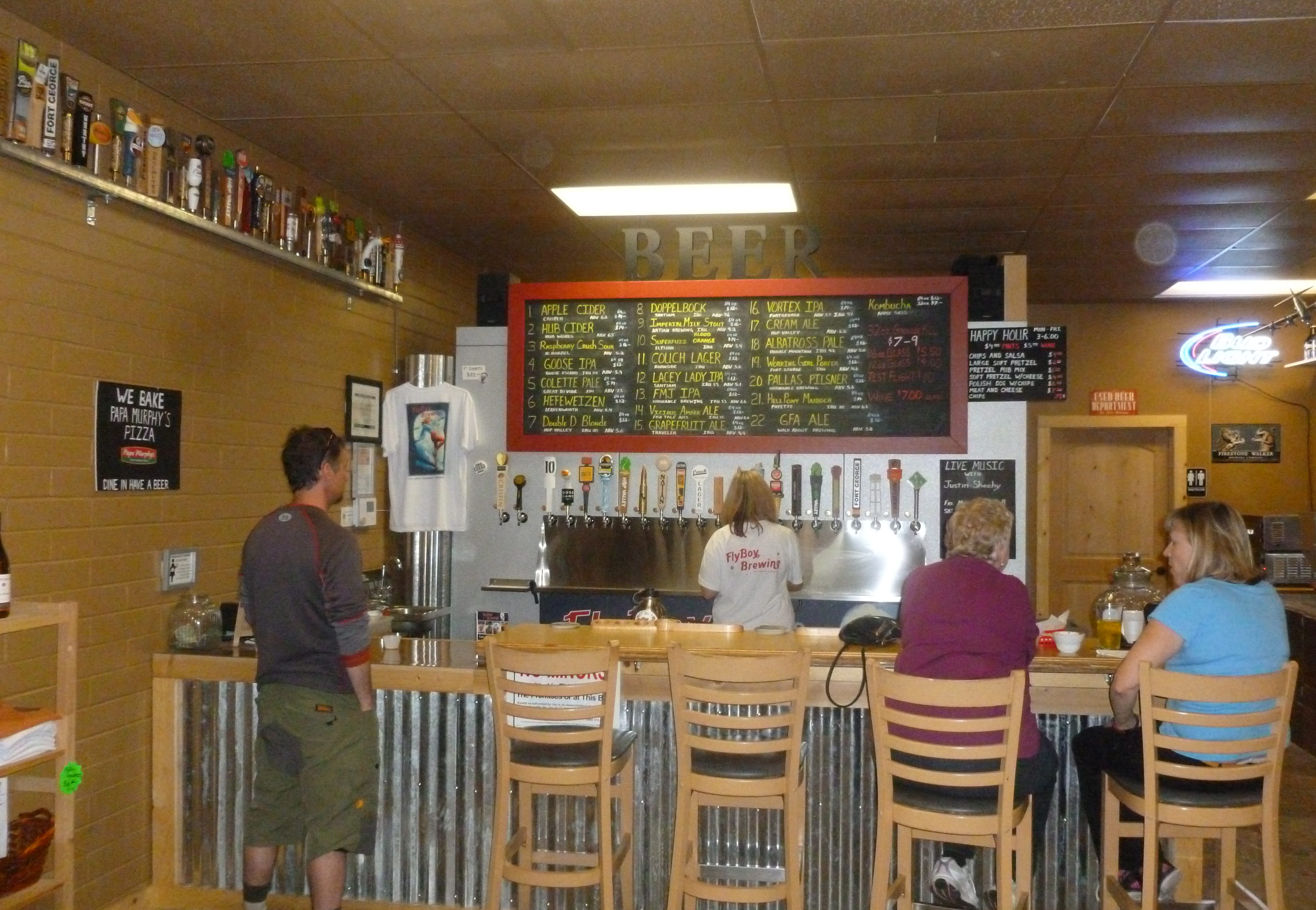 Happy-hour is 3 to 6 PM each weekday and all day Sunday. That means Flyboy brews are only $4 per pint, $1 off wine and good appetizers ranging from $5 to $8.