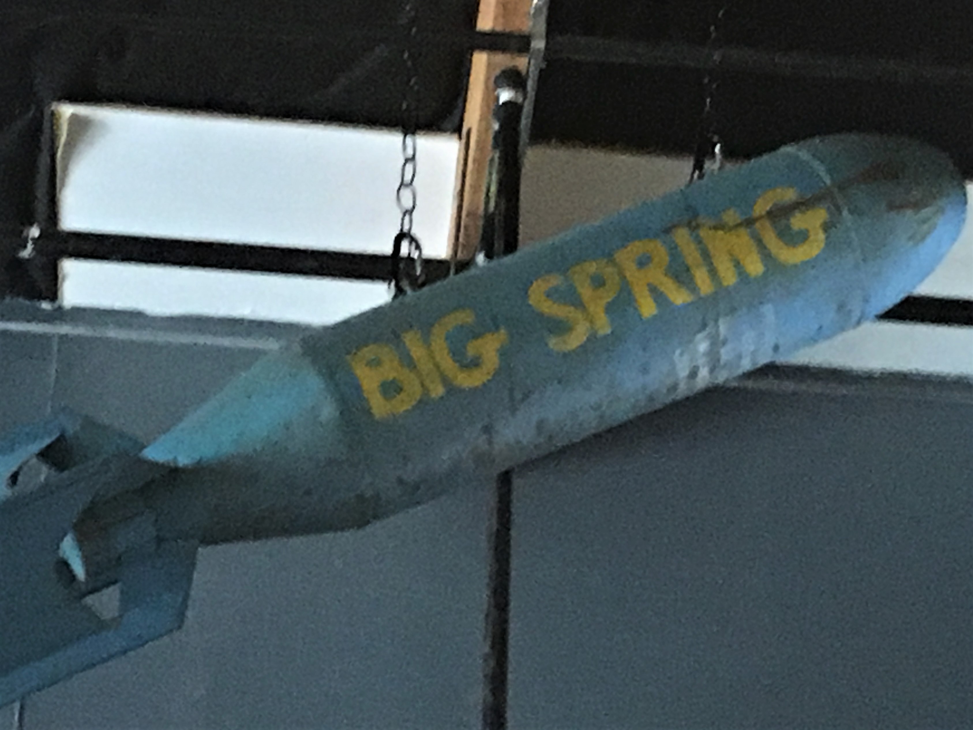 The flag and the dummy bomb (from training exercises at the Big Spring Army Air Corps Base in Texas) were his grandfather’s and complement the art and the other aviation memorabilia.