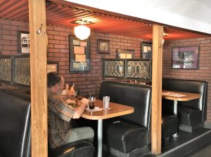 ….. Art deco lamps hang from the uneven …….The back wall is lined with photos, like the signed celebrity photos in many historic dining rooms. But here they are all pictures of loyal customers.”