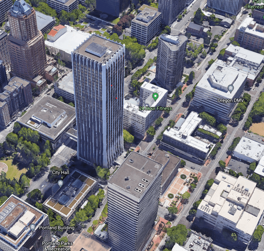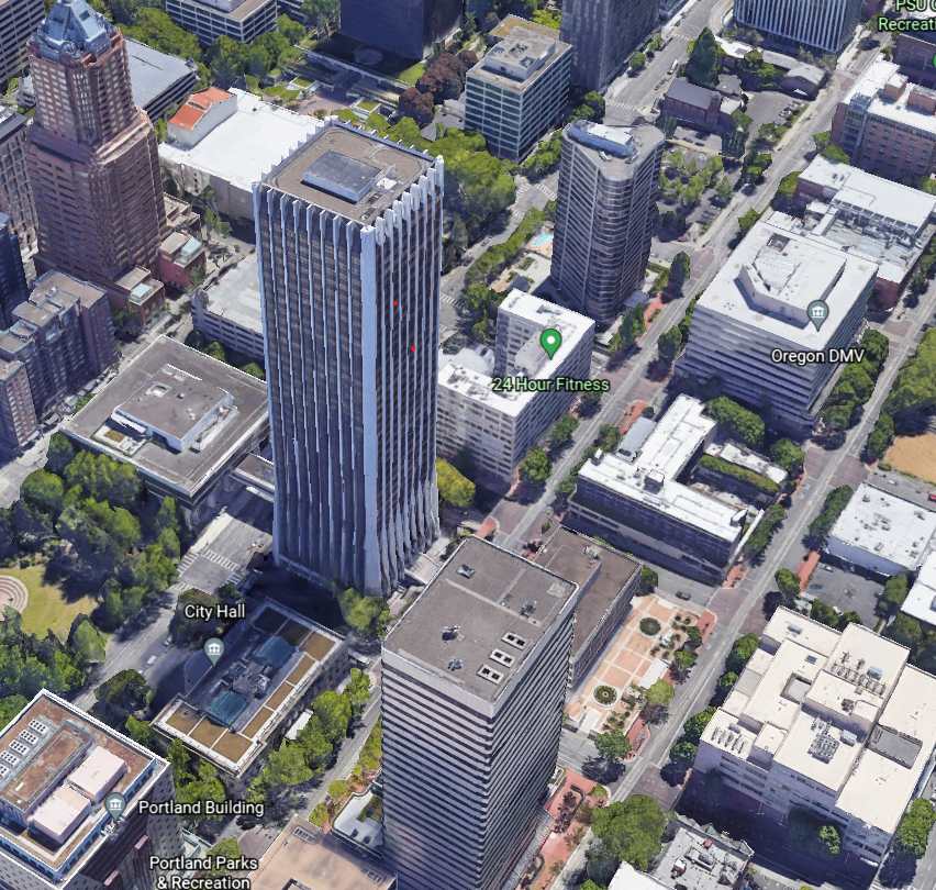 The NBA Security guru, while in Portland, proceeded to visit the multiple high rises in the adjacent blocks (see photo below) where he evidently got permission from building management to go up on the roofs to see what visibility the east side of the Pacwest Center would present to photographers who attempted to film the hearing and witnesses (Really!?).