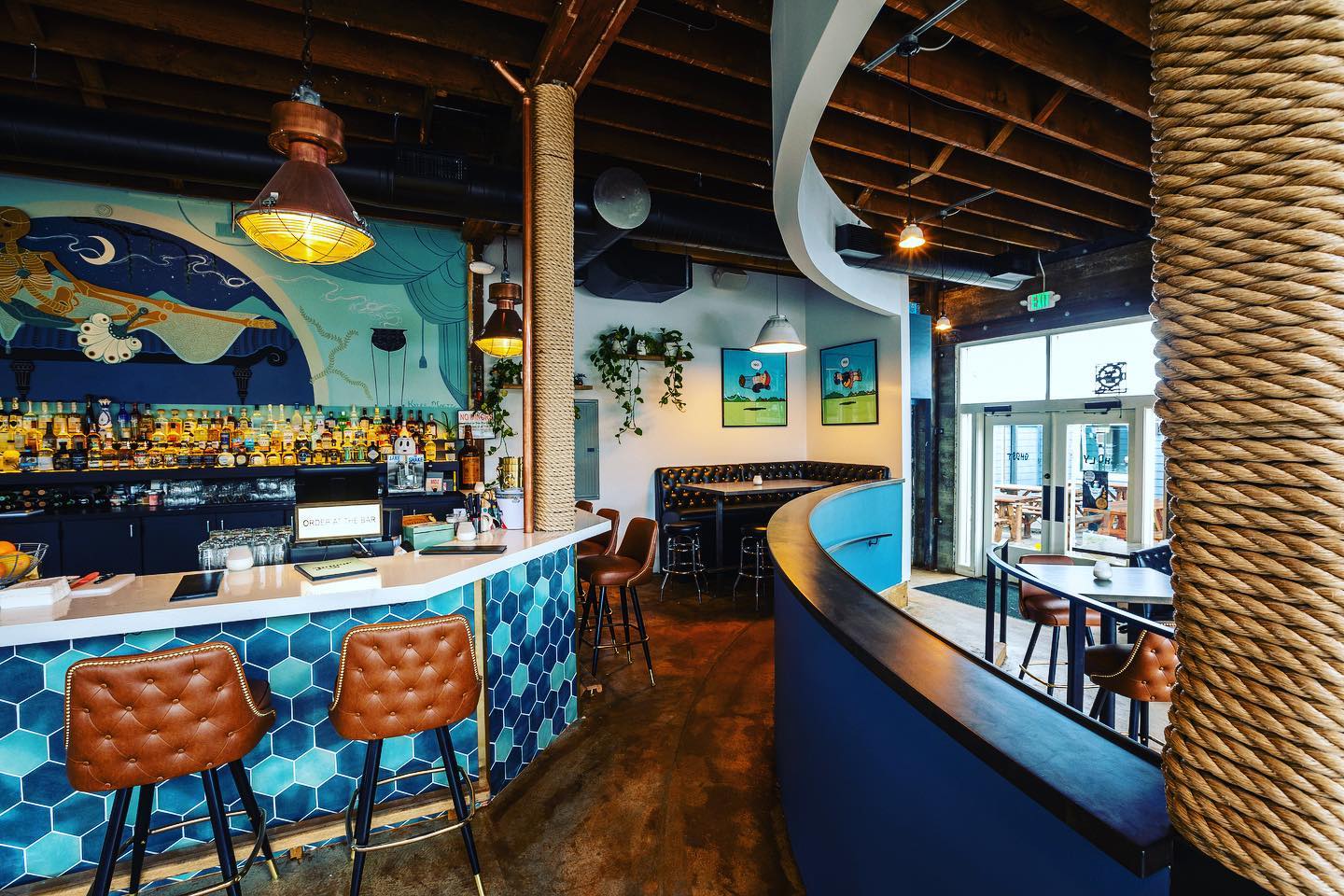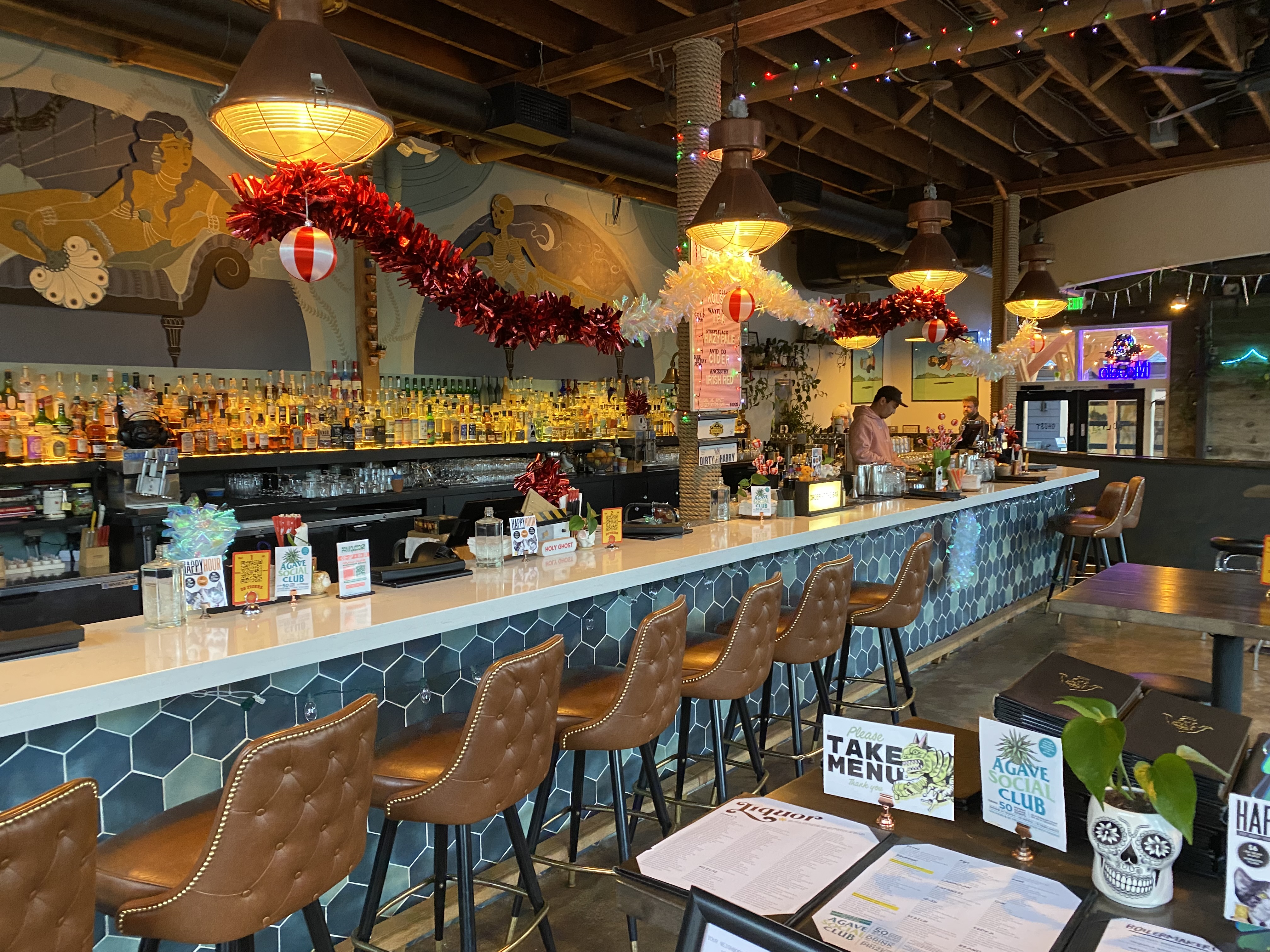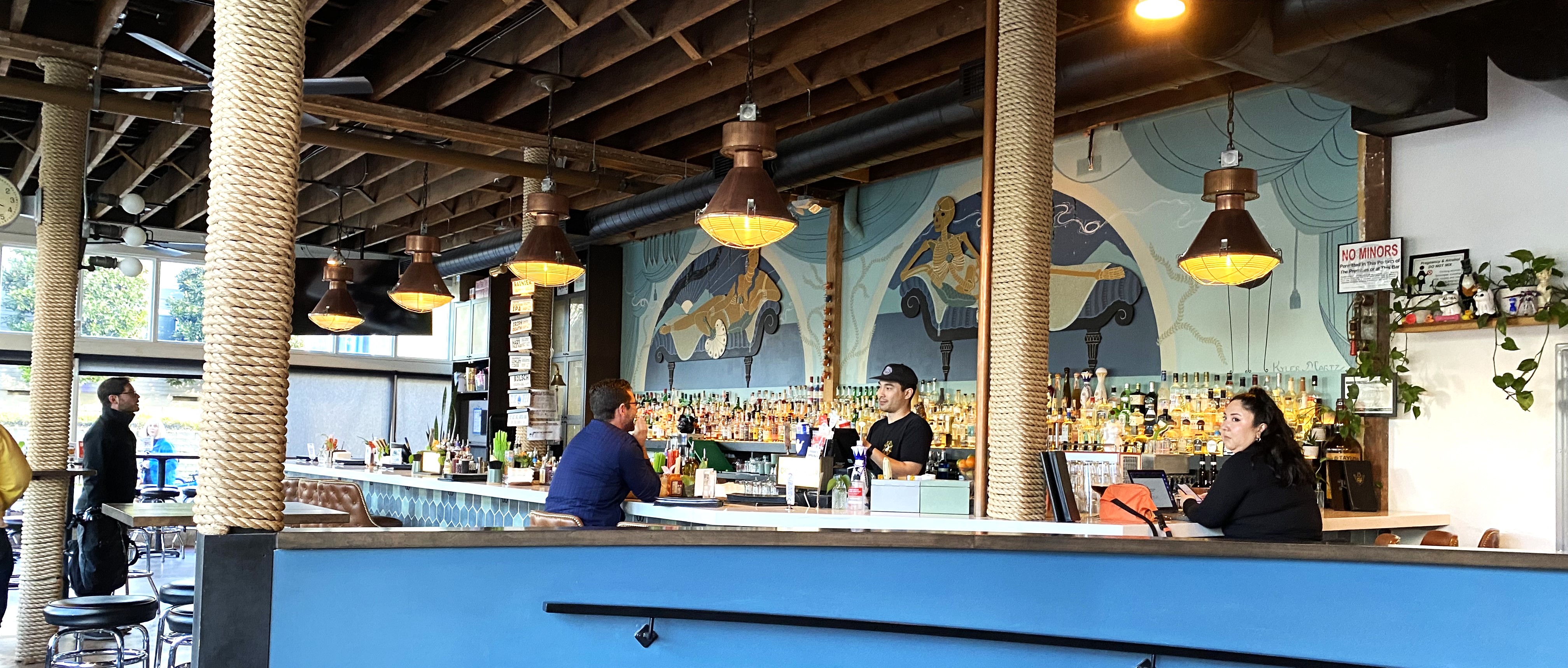 While at the bar, I asked bartender, Jason, how the title of the bar was derived. He immediately responded, “Take a glance upward. You see that 7,800 gallon aquarium? (To put in perspective, that would be about 503 kegs of beers.) A few nights each week, we also have “mermaids” swimming in that tank. Now do you understand how we got our name.?”
