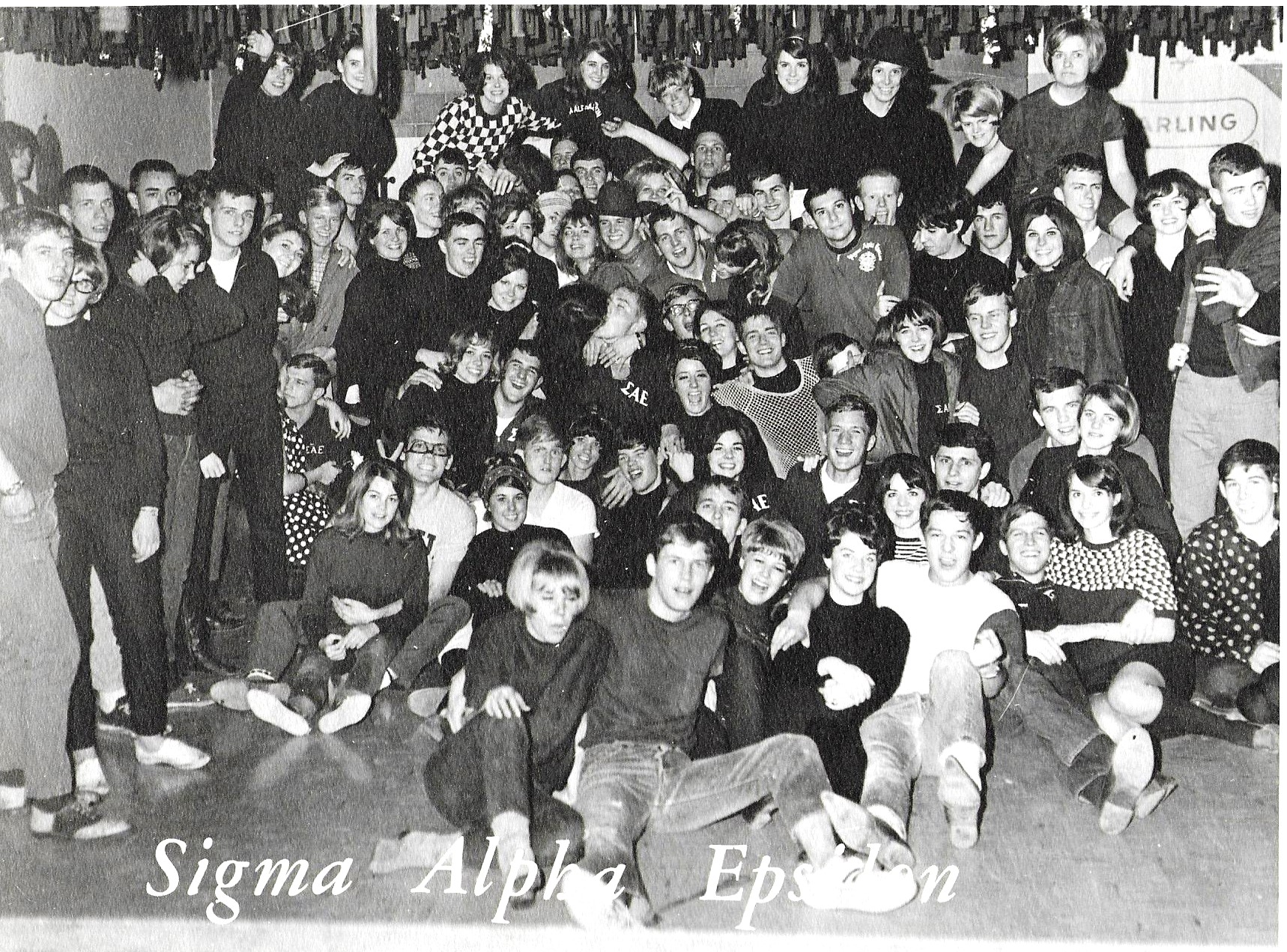 The SAE House in 1966 – (Scheele 3rd right back row – Blackford, Lewis, Whitney – back row right- Barton 3rd row five in from right – Wahle second row fourth from left with bandage! – ) Rich, Smith, Welch and Cantlon not present)