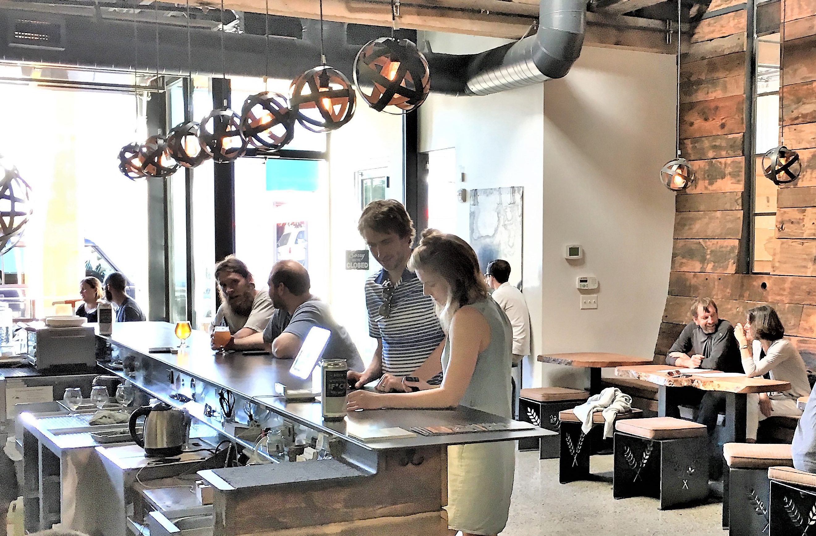 “The sparse, wood-grained brewpub signals its experimental nature with lab-themed decor: Light fixtures look like diagrams of the atom, and the back wall sports a series of beakers and Erlenmeyer flasks arranged on shelves like shoes at Nordstrom.”  Willamette Week Bar Review (12/30/15)