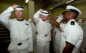 Thirty midshipman spent about eight weeks as the lowest status crew members, wearing our sailor dixie-cups with a blue band around them – swabbing decks, sweating on midnight watches in the boiler and engine rooms, standing watch as lookouts on the ship’s bridge and to the amusement of the crew, learning naval terminology – the walls are “bulkheads” and the stairs between deck levels are “ladders” which take you “topside” or “down below.”