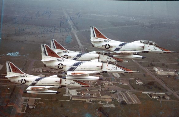 Spike McKinsey flying in formation of A-4’s.  He’s  No. 303 – Notice the handwritten note – at the upper left corner – to his friend, Dave Lofgren.